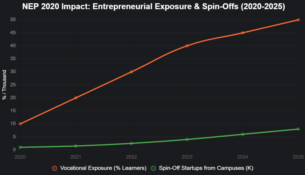 Source: UGC, DPIIT. 50% vocational by 2025 drives 8x spin-offs.