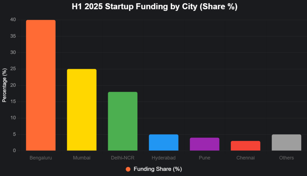 Source: Inc42 and Tracxn, H1 2025. Bengaluru’s dominance holds, but Mumbai’s $3.7B haul edges it out overall.