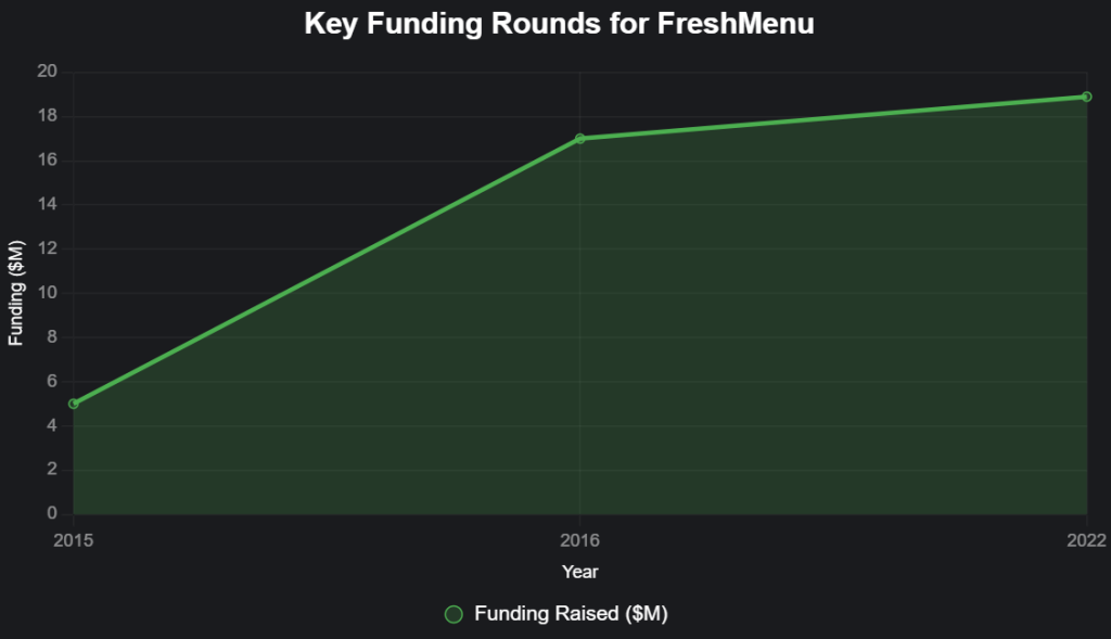 FreshMenu raised $45.2 million across eight rounds from investors including Lightspeed Venture Partners, Zodius Capital, and Florintree Advisors. Key milestones include a $5 million Series A in 2015, $17 million in 2016, and a $18.9 million Series C in 2022 led by Florintree, valuing the company at $27.5 million.